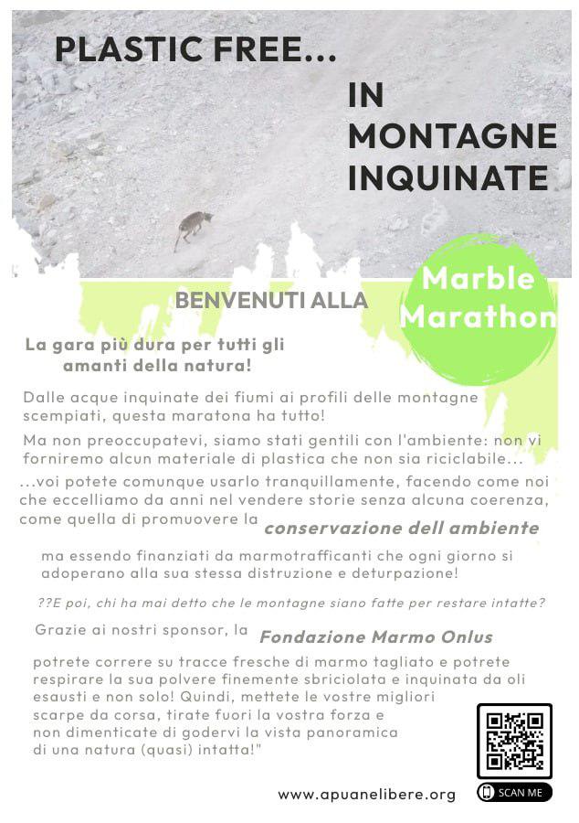 Per quanto riguarda la “maratona del marmo bianco” noi però non ci siamo voluti fare il sangue troppo amaro. Ci preme far capire questo concetto di pennellata verde, l’ennesima, sul quel bianco che non tornerà più bosco o montagna ma rimarrà ferita aperta. Magari ossidata e scura come il mondo che l’ha prodotta. Questo ci preme.