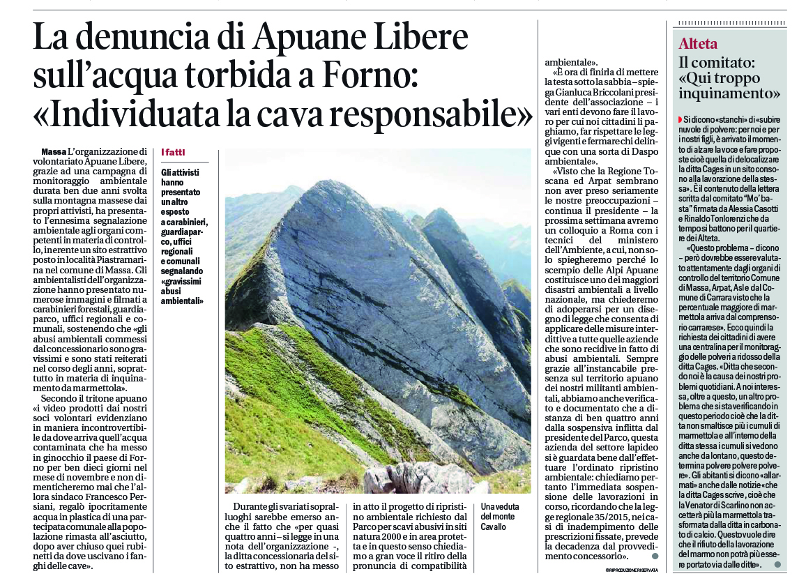 Visto che la Regione Toscana ed Arpat sembrano non aver preso seriamente le nostre preoccupazioni – continua il presidente – la prossima settimana avremo un colloquio a Roma con i tecnici del Ministero dell’Ambiente, a cui, non solo spiegheremo perché lo scempio delle Alpi Apuane costituisce uno dei maggiori disastri ambientali a livello nazionale, ma chiederemo di adoperarsi per un disegno di legge che consenta di applicare delle misure interdittive a tutte quelle aziende che sono recidive in fatto di abusi ambientali. Sempre grazie all’instancabile presenza sul territorio apuano dei nostri militanti ambientali, abbiamo anche verificato e documentato che a distanza di ben quattro anni dalla sospensiva inflitta dal Presidente del Parco, questa azienda del settore lapideo si è guardata bene dall’effettuare l’ordinato ripristino ambientale: chiediamo pertanto l’immediata sospensione delle lavorazioni in corso, ricordando che la Legge Regionale 35/2015, nei casi di inadempimento delle prescrizioni fissate, prevede la decadenza dal provvedimento concessorio. I nostri attivisti – conclude Briccolani – hanno appurato che dal sito estrattivo Padulello posto a quota 1470 metri e che sta eviscerando il ventre del Monte Cavallo, a seguito delle recenti forti precipitazioni piovose, vengono dilavate via dai piazzali di cava, ingenti quantitativi di segagione del marmo mista a derivati del petrolio, che scendono direttamente nell’alveo del canale delle Marinelle, affluente del fiume Frigido e in diretta corrispondenza con la sorgente del Frigido sita presso il paese di Forno.