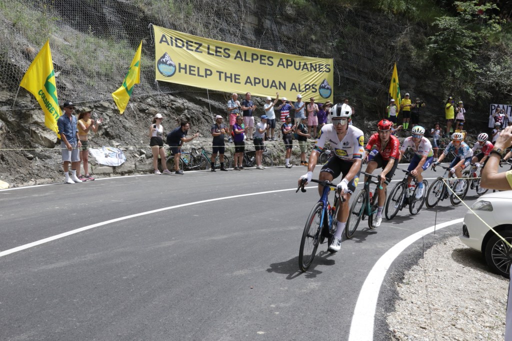 Decine di volontari dell’associazione Apuane Libere, hanno esposto striscioni di protesta durante la prima tappa Firenze-Rimini de “La Grande Bouclé”: la più famosa corsa a tappe di ciclismo su strada professionistico al mondo, che quest’anno ha visto per la prima volta la partenza dalla Toscana. Un enorme telo rosso di 180 metri quadri con su scritto “Liberiamo le Alpi Apuane” ed uno giallo più piccolo con le traduzioni in francese ed inglese del motto “Aiuta le Alpi Apuane”, sono stati esposti nei pressi del traguardo volante del Gran premio della montagna al Valico Tre Faggi al confine tra Toscana ed Emilia-Romagna.