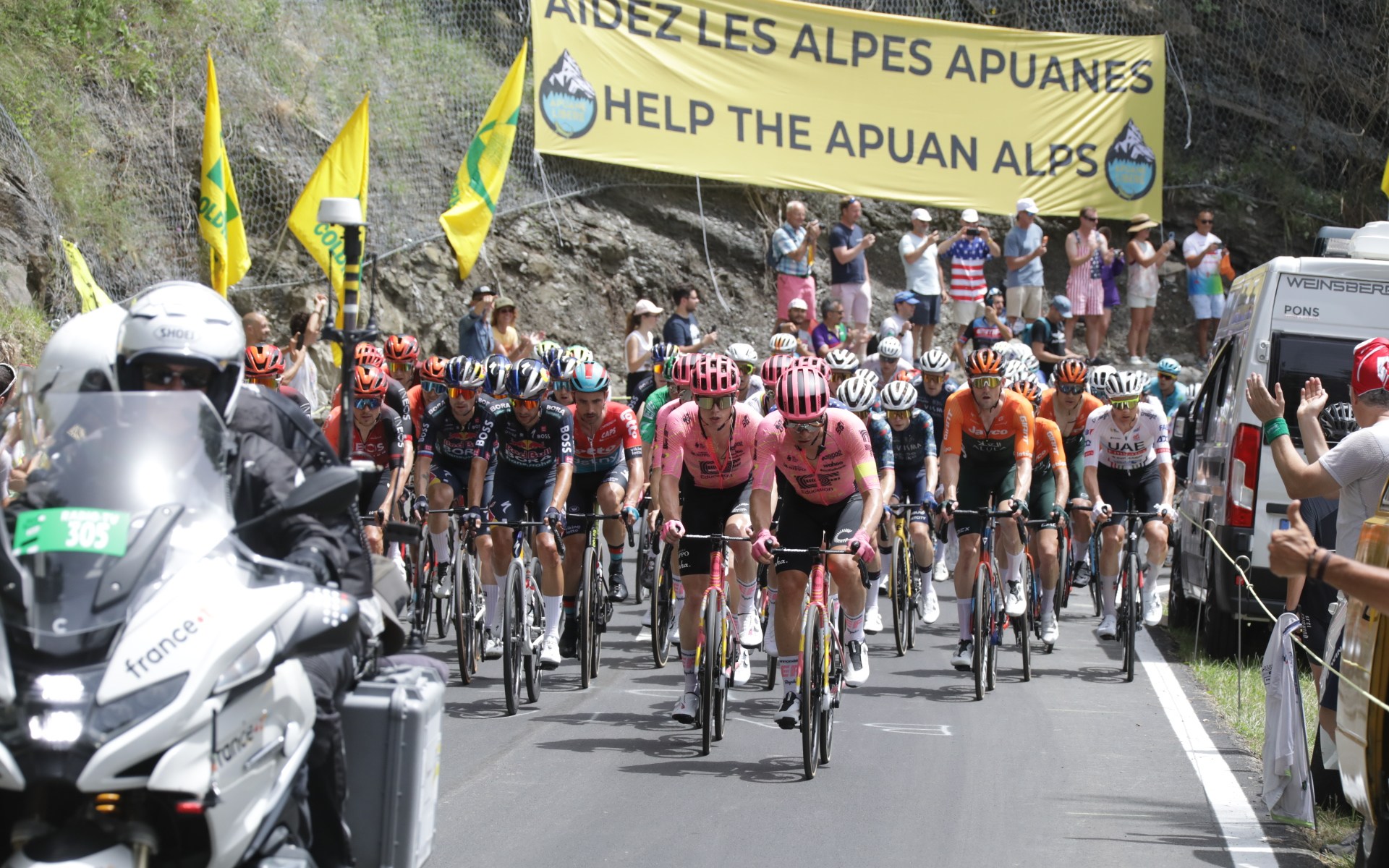 Decine di volontari dell’associazione Apuane Libere, hanno esposto striscioni di protesta durante la prima tappa Firenze-Rimini de “La Grande Bouclé”: la più famosa corsa a tappe di ciclismo su strada professionistico al mondo, che quest’anno ha visto per la prima volta la partenza dalla Toscana. Un enorme telo rosso di 180 metri quadri con su scritto “Liberiamo le Alpi Apuane” ed uno giallo più piccolo con le traduzioni in francese ed inglese del motto “Aiuta le Alpi Apuane”, sono stati esposti nei pressi del traguardo volante del Gran premio della montagna al Valico Tre Faggi al confine tra Toscana ed Emilia-Romagna.